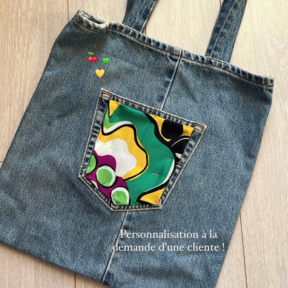 Nous avons personnalisé un sac en jean ! Le processus a consisté à choisir le foulard ensemble, puis à passer à la couture.